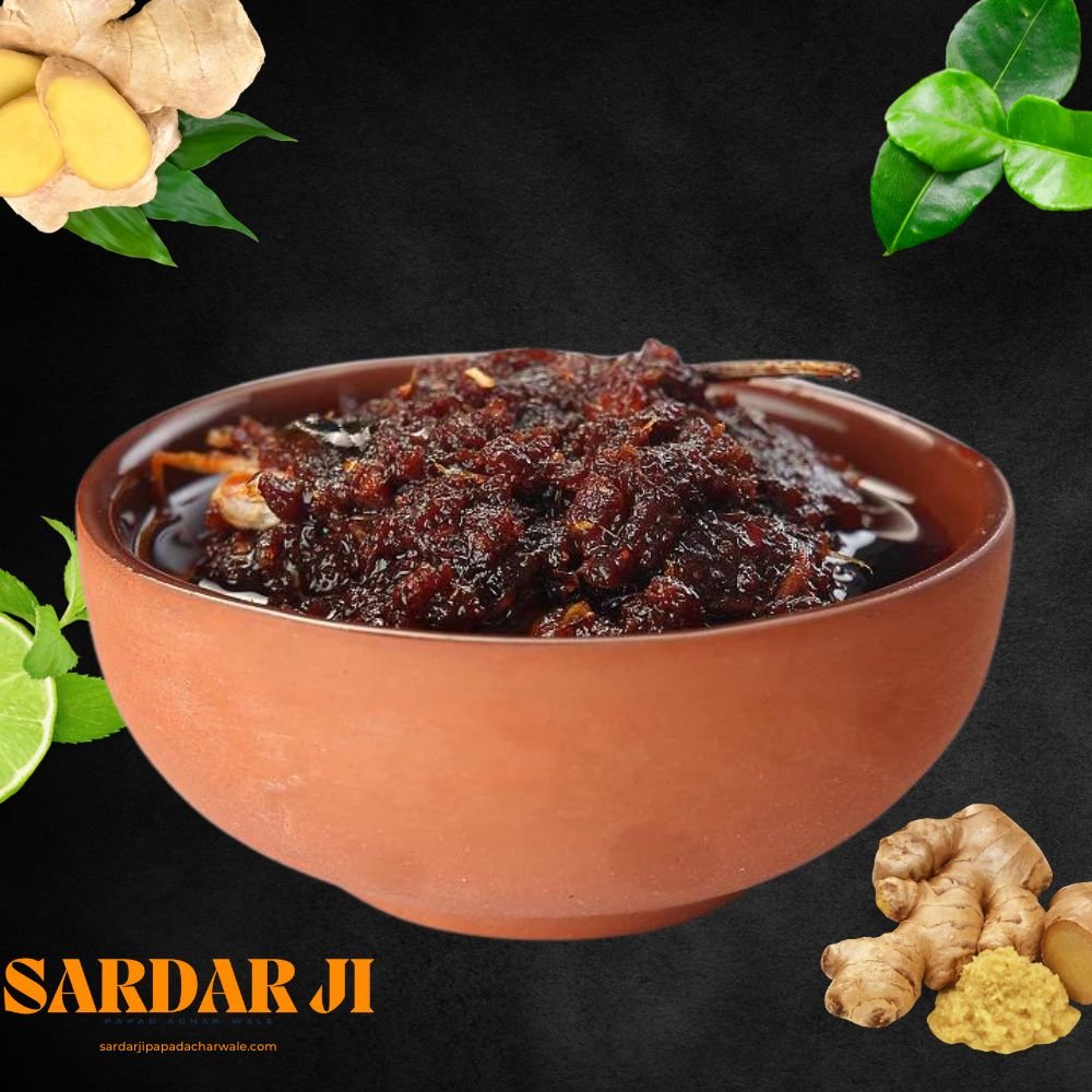 Sardar Ji Papad Acharwale ignites your taste buds with our Ginger Pickle. This classic Indian condiment is a fiery celebration of fresh ginger, carefully pickled and infused with aromatic spices, creating a flavor explosion of heat, earthiness, and a touch of sweetness that will tantalize your senses and leave you wanting more.